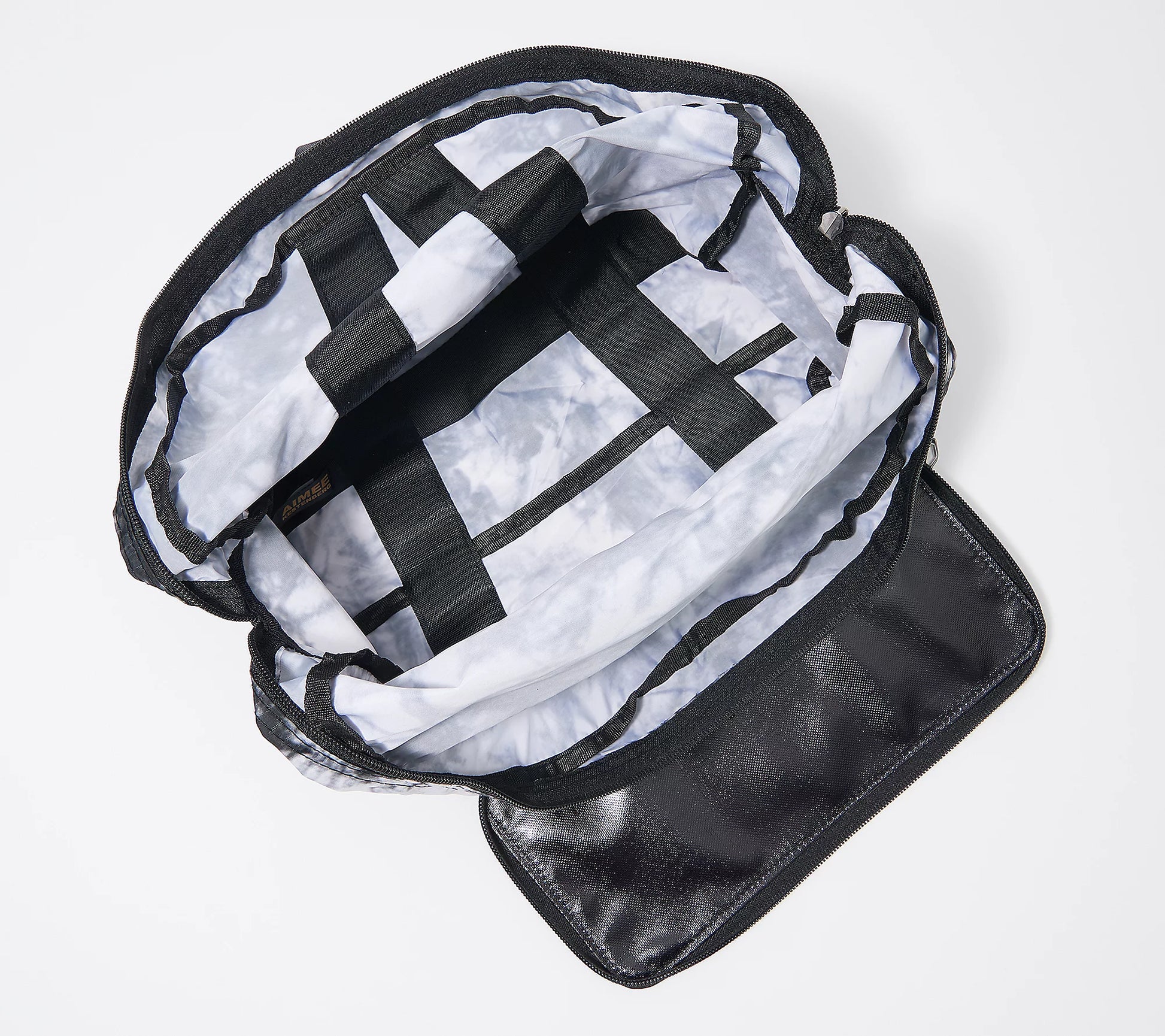 - Top handle, adjustable straps, front zipper pocket, folds into a small pouch on the front pocket, custom hardware