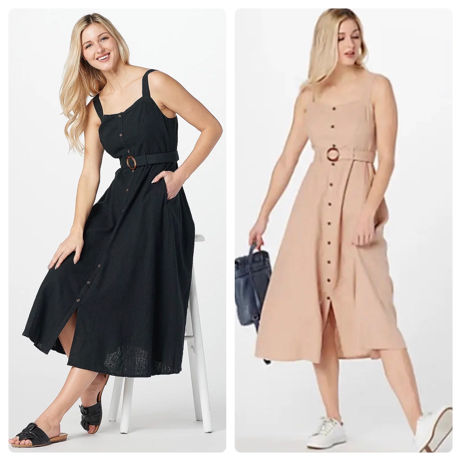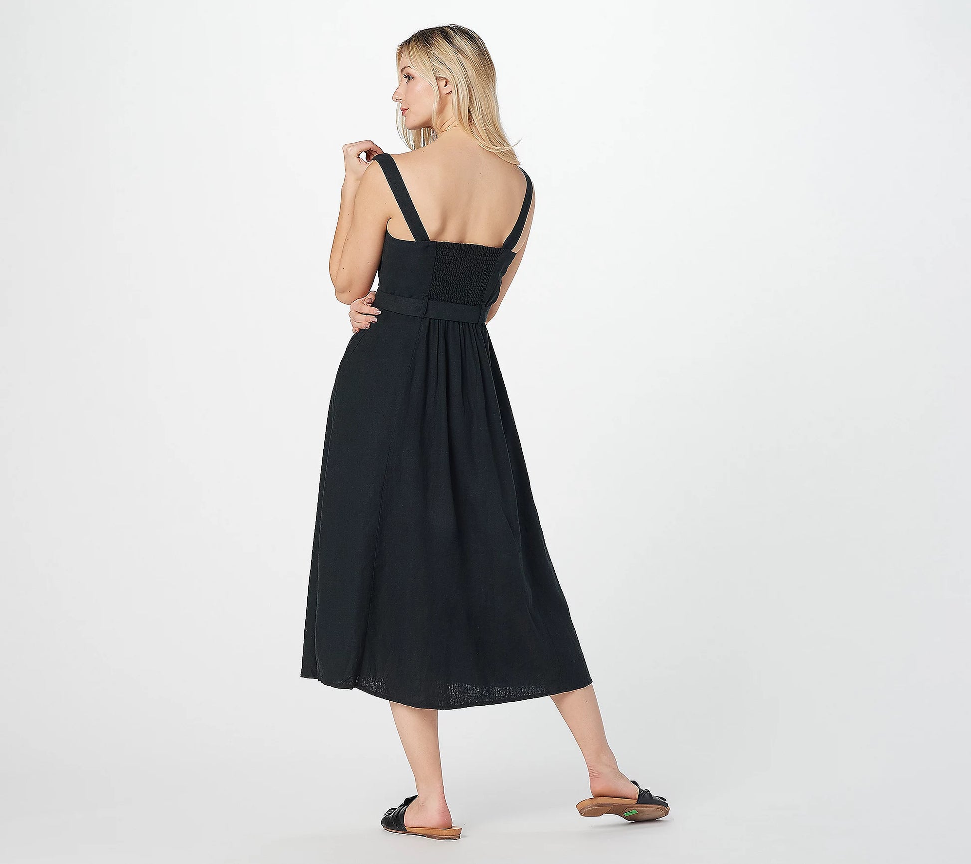 - Features: bustier, sleeveless, adjustable straps, nonfunctional front buttons, belted, side-seam pockets