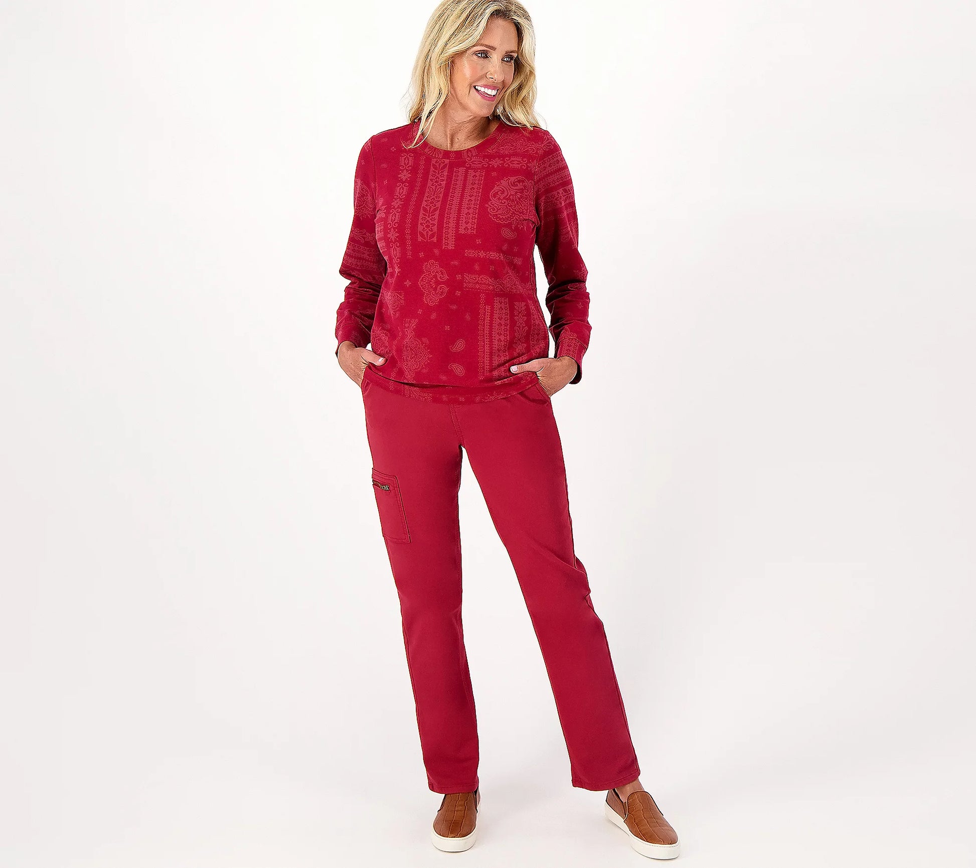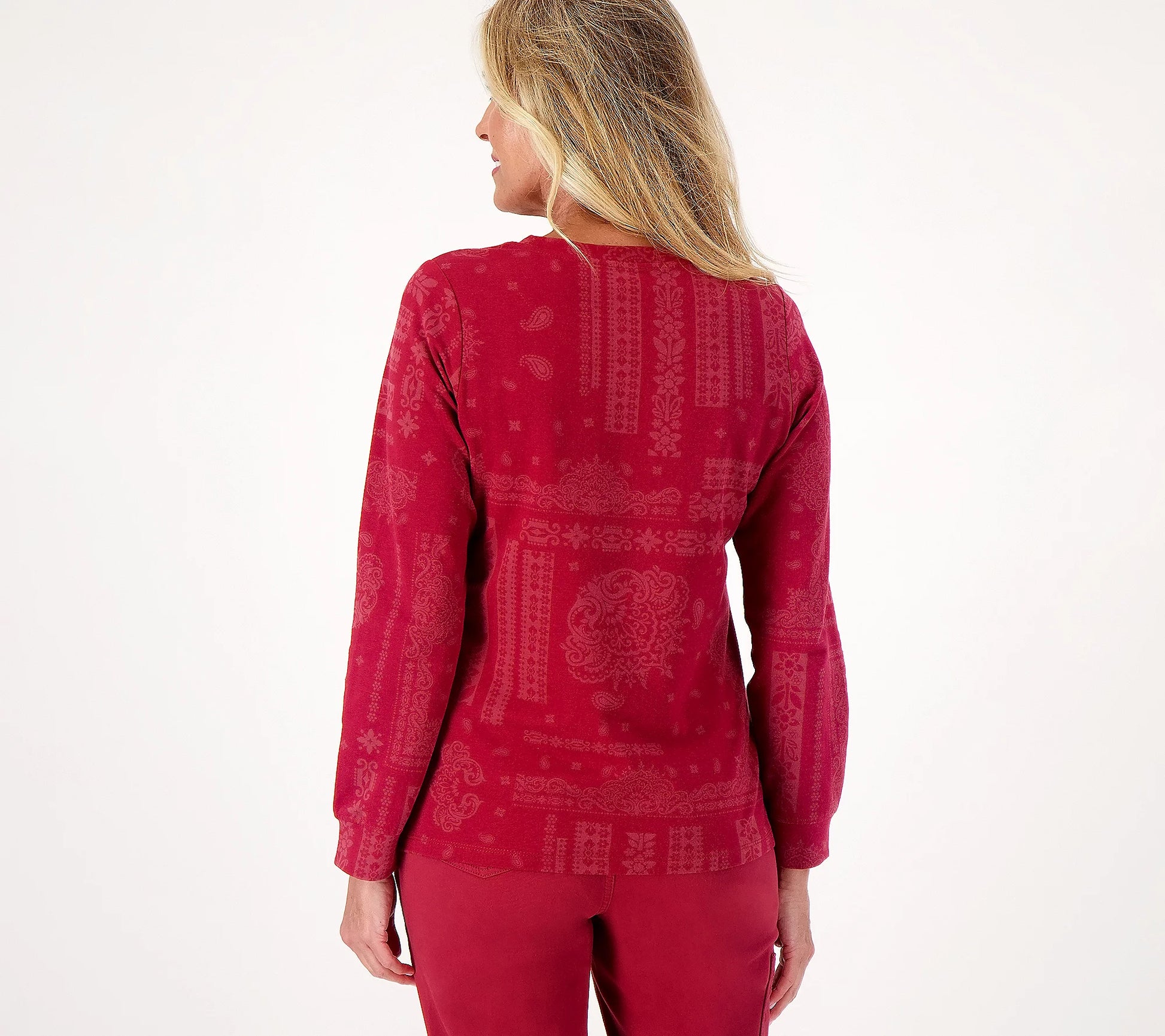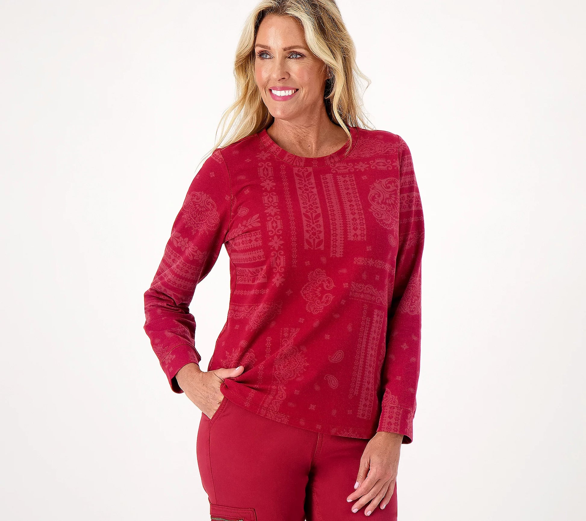 Denim & Co. Women’s Active Printed French Terry Round Neck Pullover