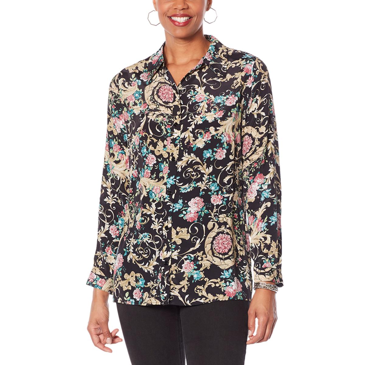 DG2 by Diane Gilman Printed Silk-Blend Buttoned Shirt- Black Printed