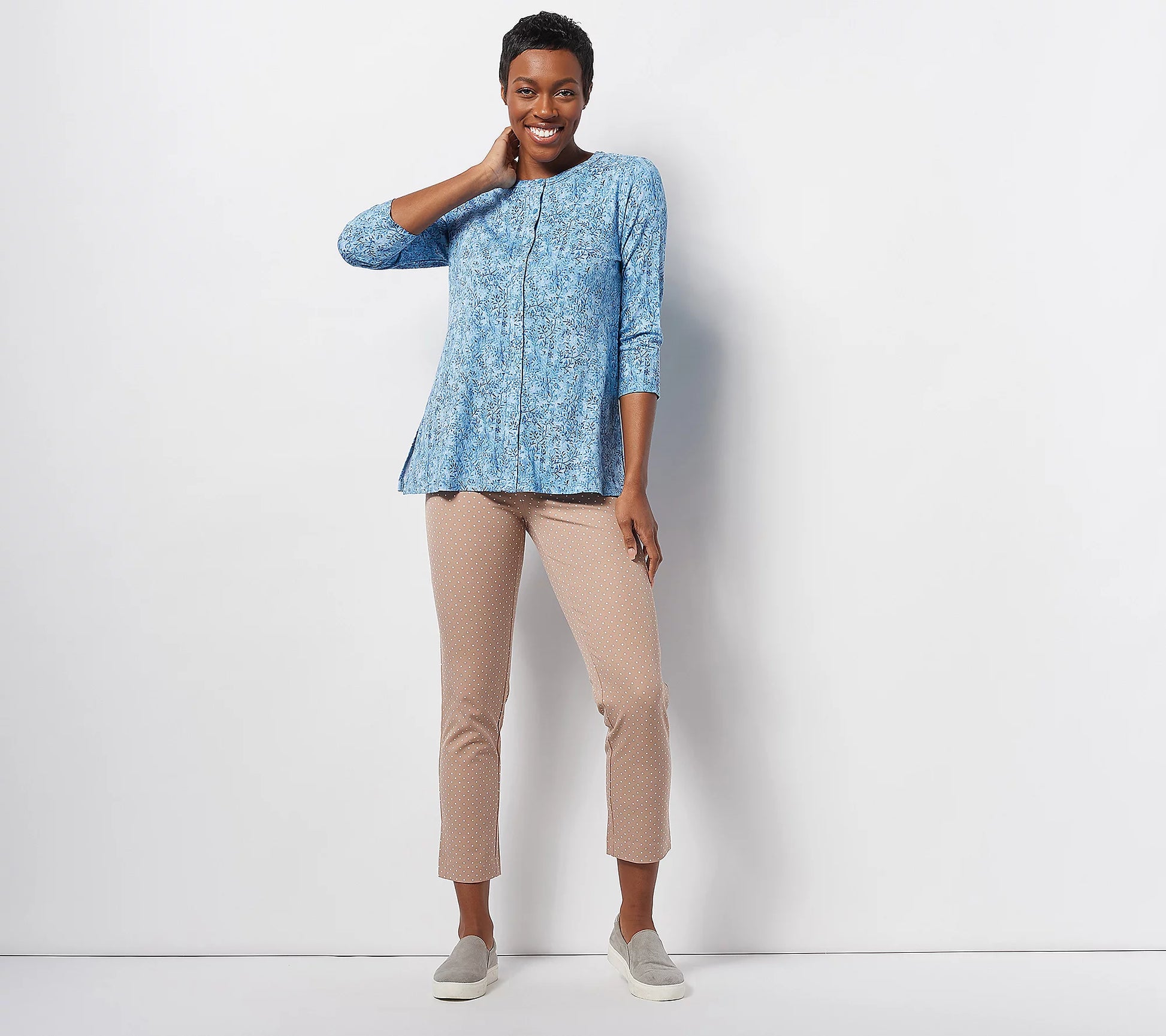 - Features: Allover floral print, button-front placket, convertible point collar, long sleeves, two-button placket cuff with sleeve vents, lower patch pockets, cascade swing hi-low hem