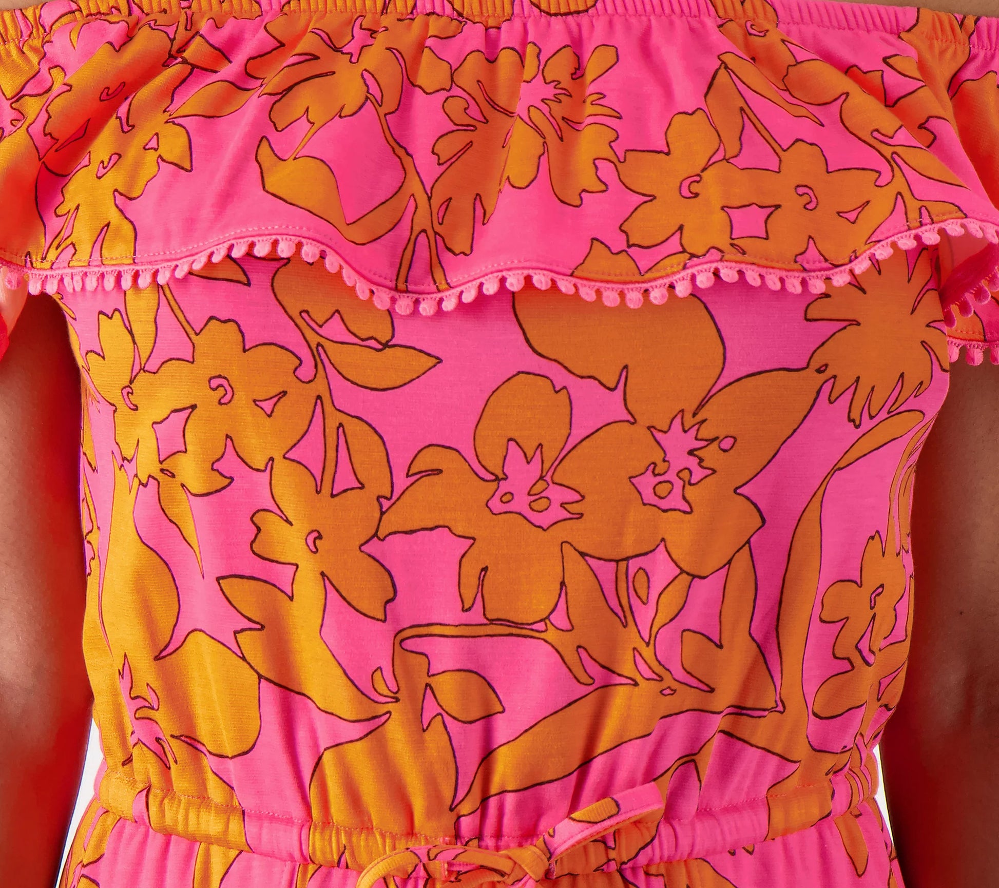 - Features: flounce neckline, fringe trim, convertible neckline, side-seam pockets, elastic at waist, tie with tassel ends