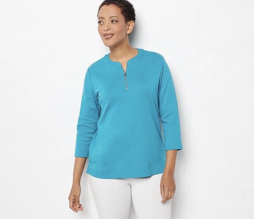 Elevate your wardrobe with this stunning Isaac Mizrahi Live! Women's Top in size XL. This gorgeous piece features a half zip and 3/4 sleeves, perfect for any occasion, whether it's a casual day out or a party. Made with high-quality knit fabrication, this top is both comfortable and stylish.