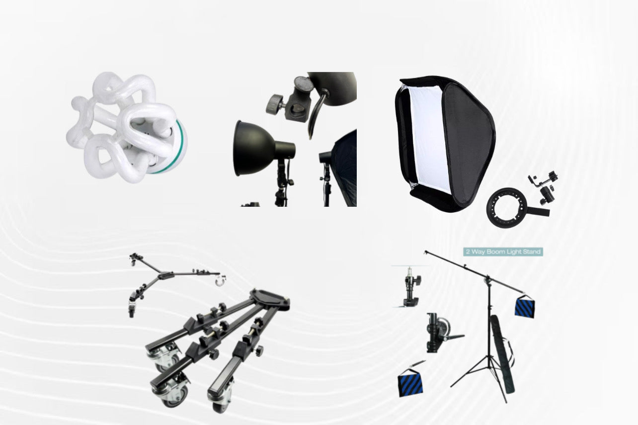 Lighting Bulbs / Heavy Duty 2-way Use Boom Stand: Sand Bag and Carry Bag / Tripod Dolly / Studio continues lightkit / Flash Softbox with Mounting