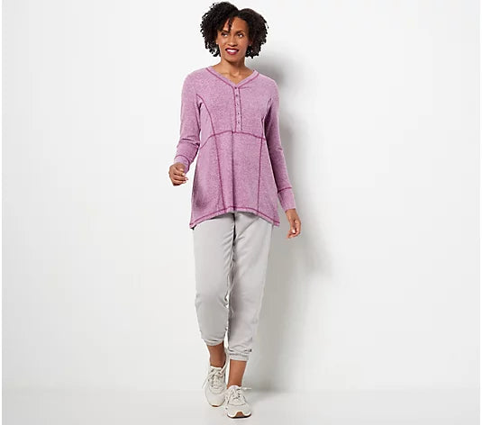A peplum hem, button detail, and side pockets are pretty and practical features that make this henley shirt a top pick for laidback events and casual outings. From LOGO by Lori Goldstein®.