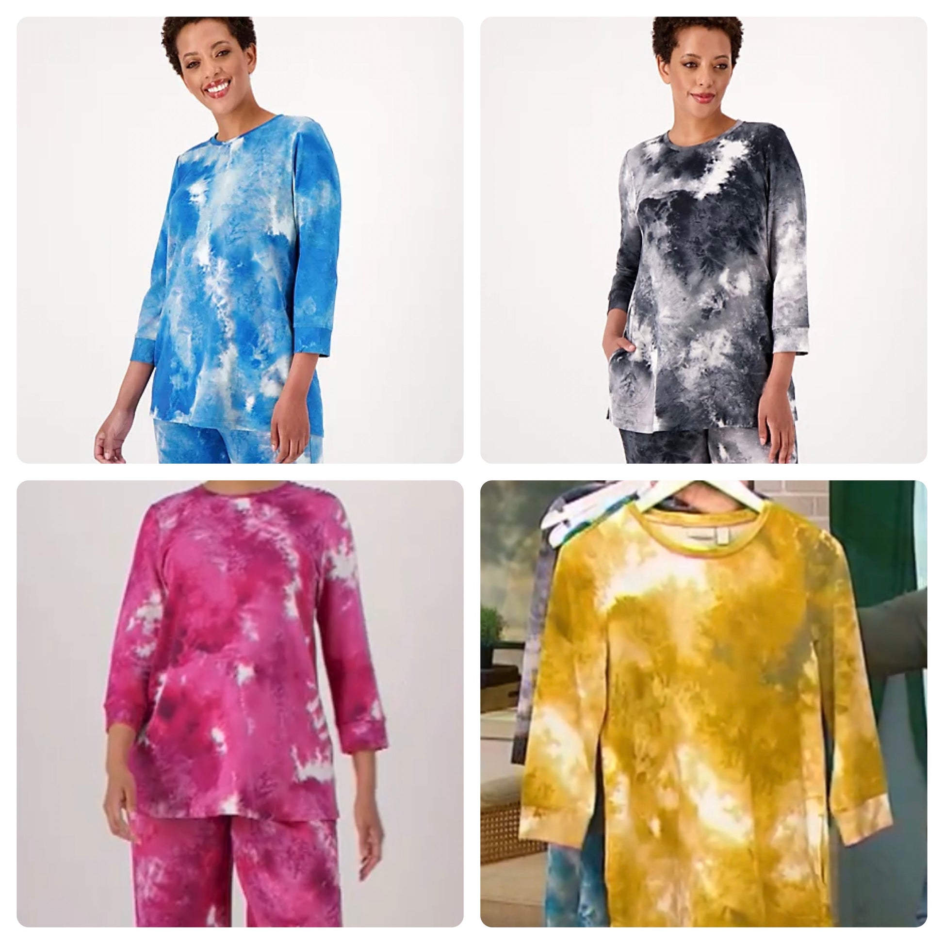 - Features: crew neckline, 3/4-length sleeves, tie-dye design, side-seam pockets, straight bottom hemline, side slits